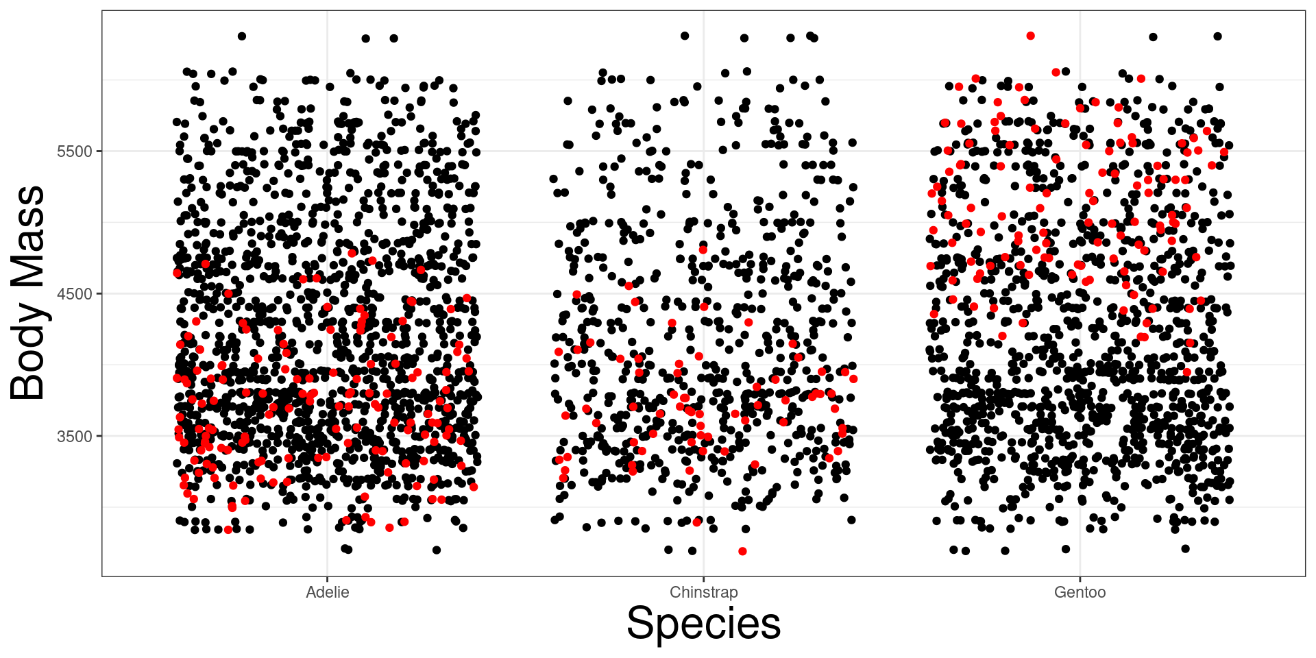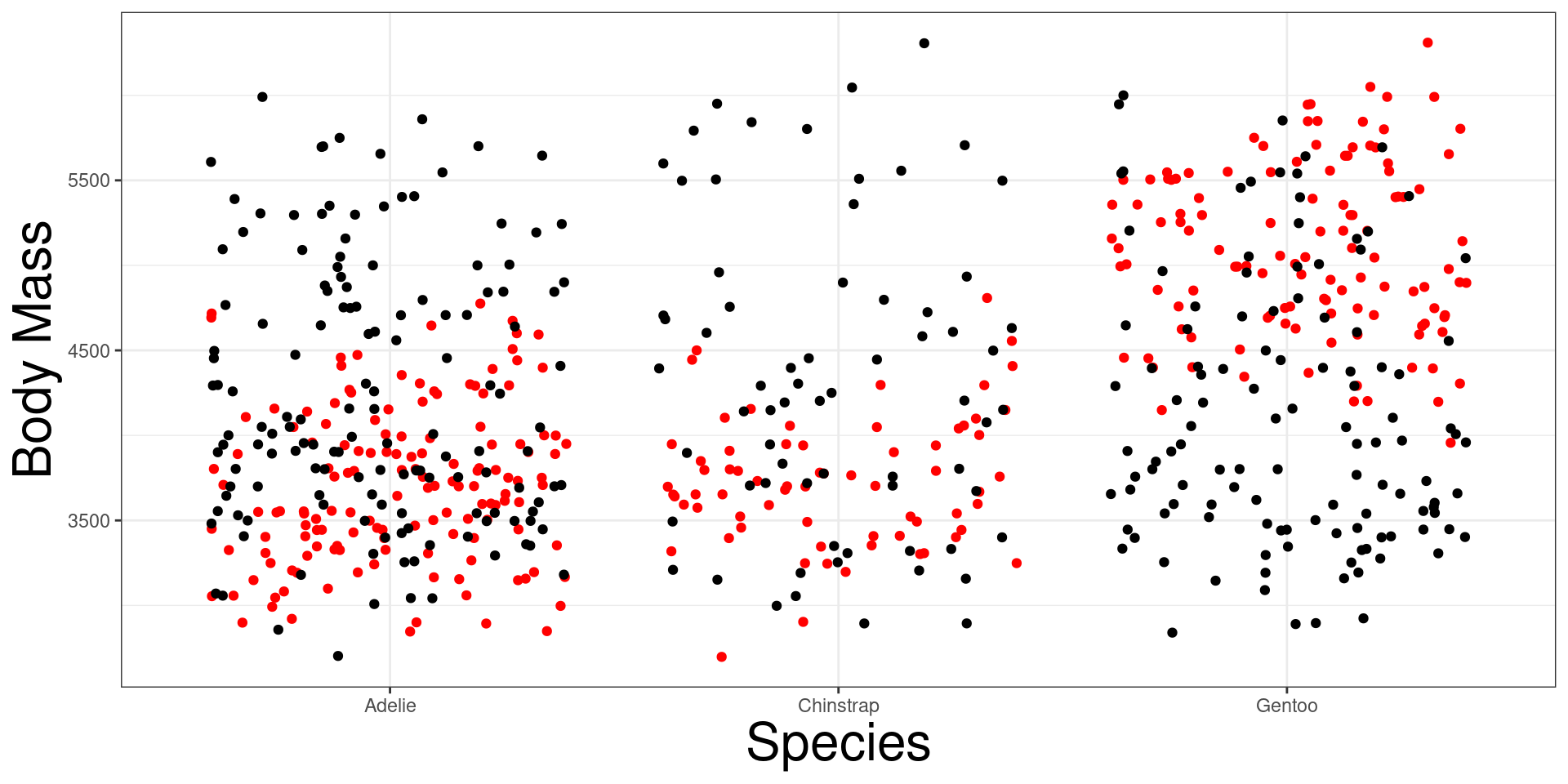 geom_jitter(col = "red") We want to determine if body mass of penguins are different for different species.