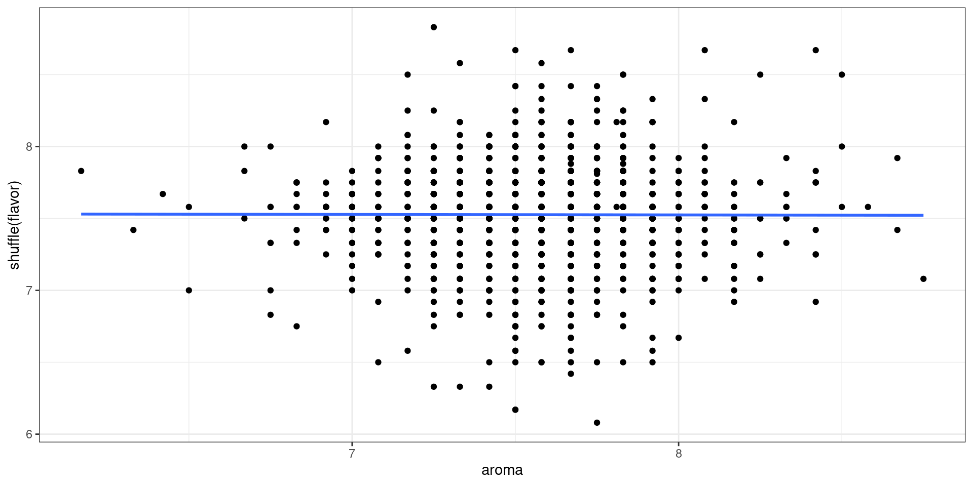 geom_smooth(mapping = aes(aroma, shuffle(flavor)), method = "lm", se = F) f_stat <- coffee_aroma |>