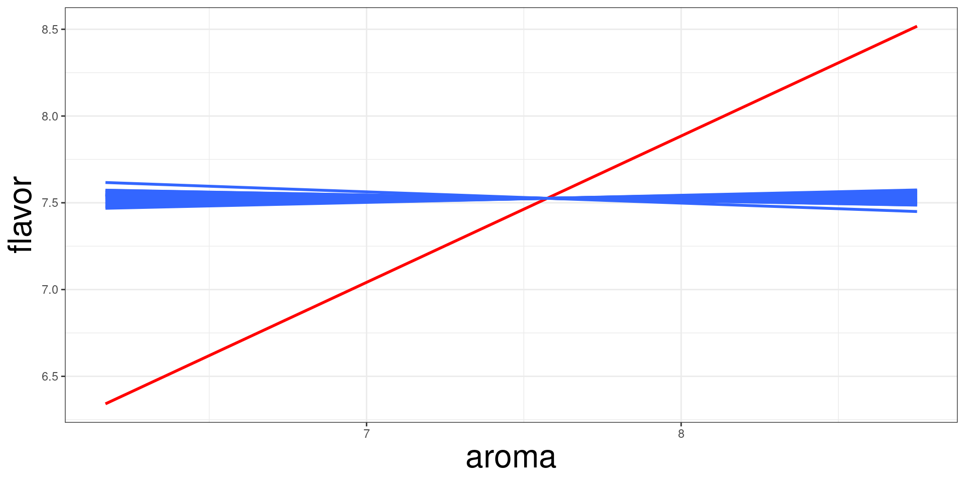 geom_smooth(mapping = aes(aroma, shuffle(flavor)), method = "lm", se = F) +